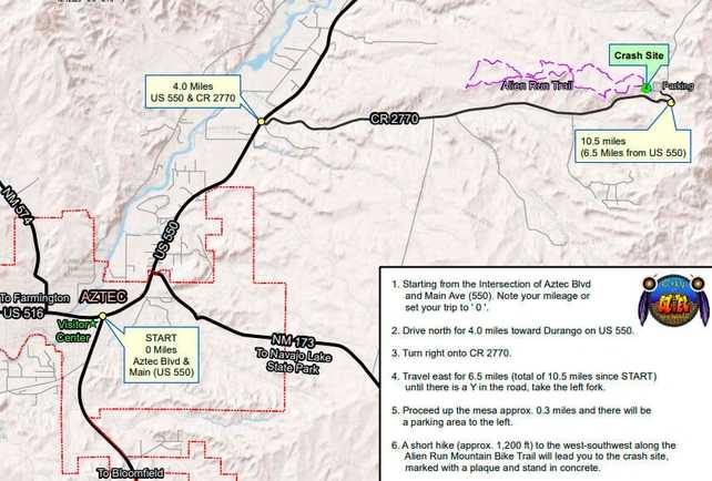 Как добраться до места крушения НЛО: из центра города Ацтек двигайтесь на север по шоссе US Hwy 550 четыре мили. На отметке 164 мили поверните направо на дорогу Hart Canyon Rd/County Rd 2770. Проезжайте на восток (это грунтовая дорога) 6,5 миль. В этом месте дорога разветвится. Поверните налево, вверх по холму, и проедьте еще полмили. Слева вы увидите парковку. Оттуда начинается тропа, часть маршрутов для горного велосипеда Alien-Run. Следуйте по ней четверть мили на запад до места крушения.