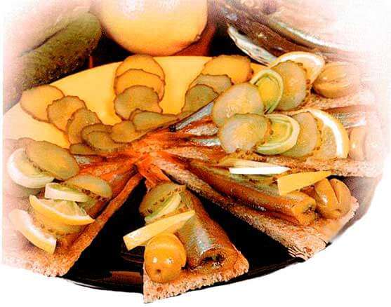 На каждый ломтик выложить копченую мойву, часть огурцов, лук-порей, ломтики лимона, оливку.