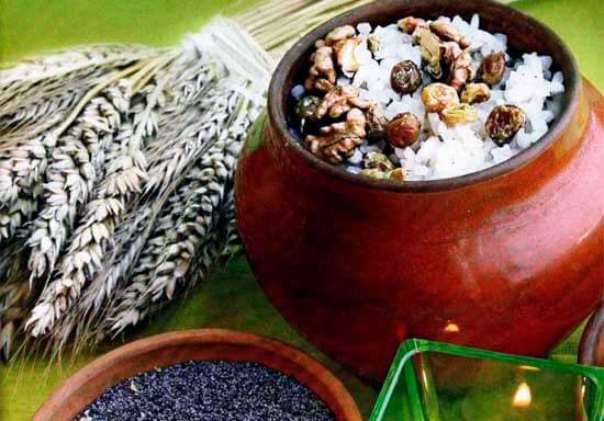 — В готовую пшеницу добавляем мак, растопленный мед, изюм и измельченные грецкие орехи.