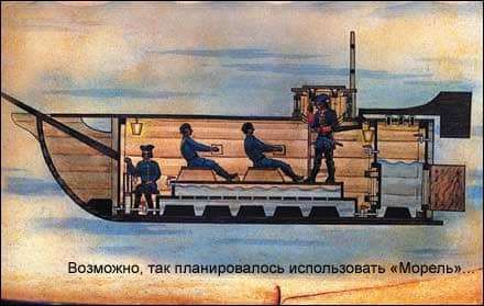 Подводная лодка «Морель» именовалась «огненным судном» потому, что ее вооружение состояло из нескольких «зажигательных труб», то есть устройств, похожих по принципу действия на огнемет разового действия (типа пресловутого «греческого огня»).