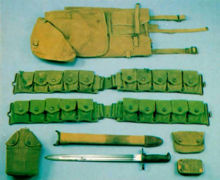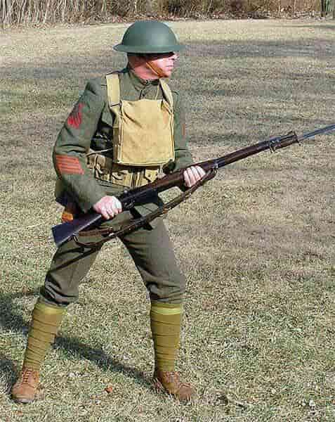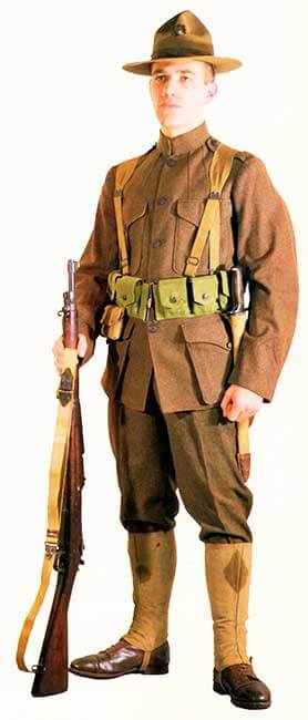 Походная шляпа с эмблемой М1914, зеленая зимняя экипировка, патронташ, подвесные ремни, перевязочный мешок, винтовка Спрингфилд М1903 с брезентовым ремнем, штык М1905 и ножны М1910, гетры М1910 и походные красновато-коричневые ботинки.