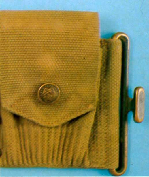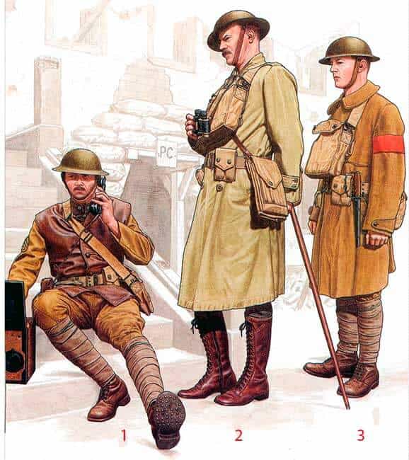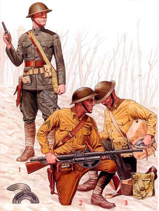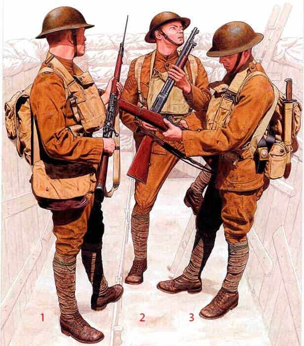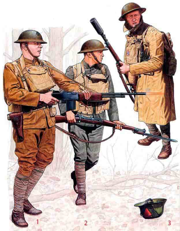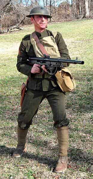 На этом рядовом все еще довоенные американские ботинки, но вскоре они будут заменены на французские или британские ботинки с шипами или американские ботинки «Першинг» M1917/18. Его британский противогаз надет высоко и готов к немедленному использованию в случае газовой тревоги.