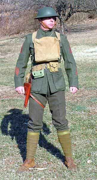 Этот квартирмейстер носит стандартную армейскую/AEF тусклую форму и портянки. Его нашивки унтер-офицера с красной обложкой и EGA на кобуре M1916 указывают на то, что он морской пехотинец.