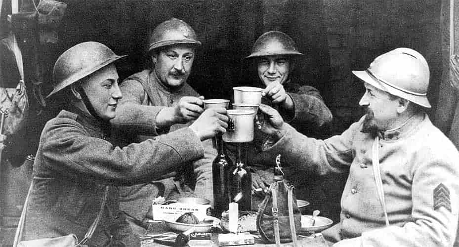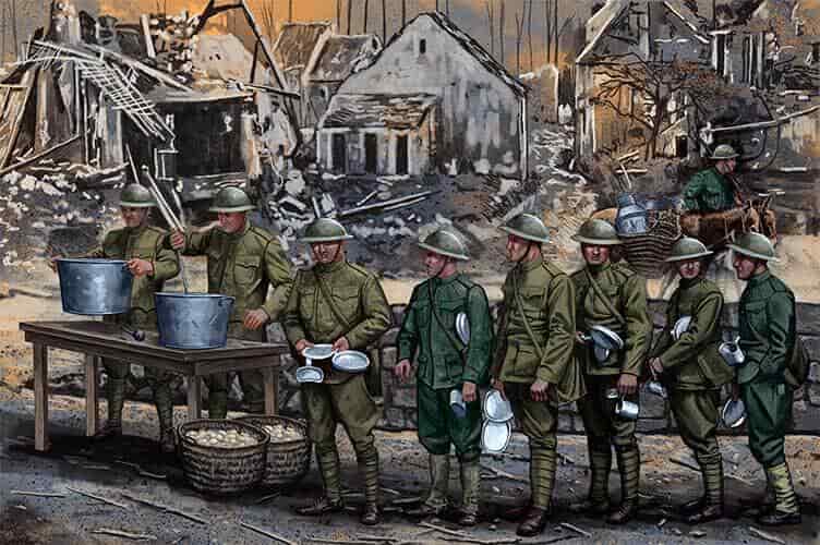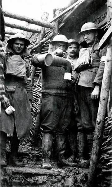 Морские пехотинцы и французский пехотинец (poilu) собирались за горячим шоколадом, купленным у продавца. Обратите внимание на резиновые сапоги, форменный свитер (обычно надеваемый под блузку) на пехотинце с кофейником и большой воротник шинели.
