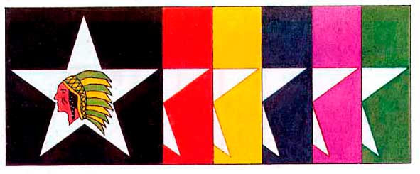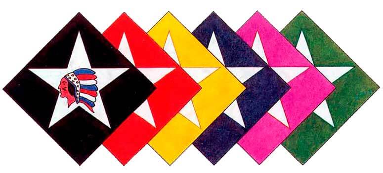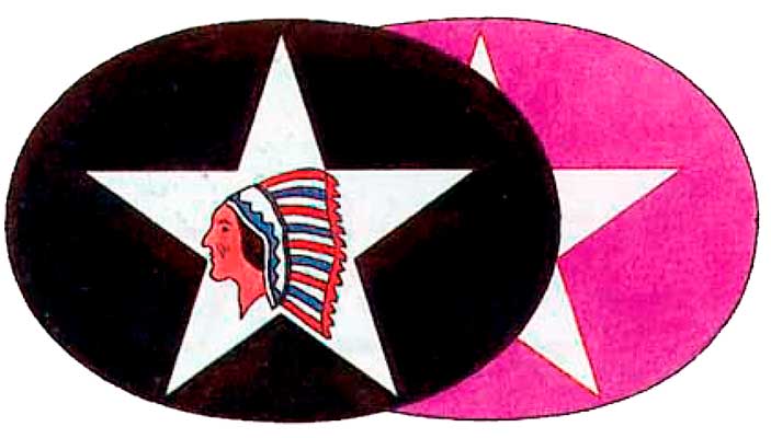 Голова индейца и мотив звезды накладывались на тканевый фон различной формы и цвета, чтобы различать подразделения дивизии.