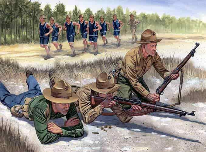В учебном лагере морской пехоты особое внимание уделялось строевой подготовке, физической подготовке и меткой стрельбе из винтовки, хотя меткая стрельба из винтовки на дальние дистанции считалась архаичным навыком в европейских армиях той эпохи.