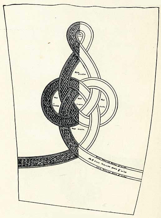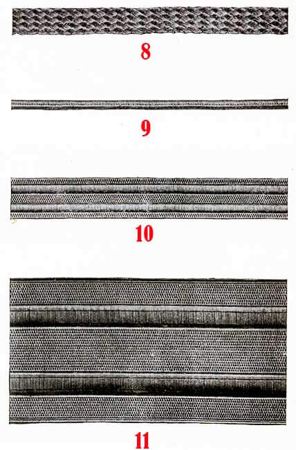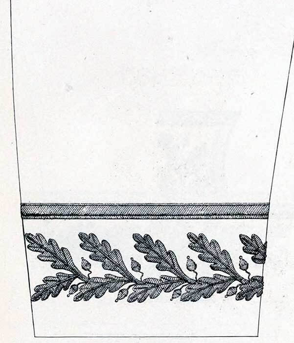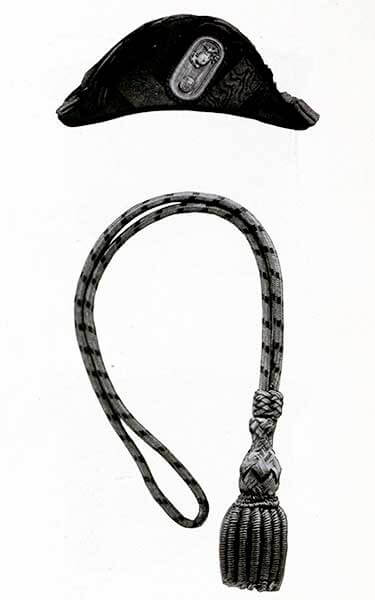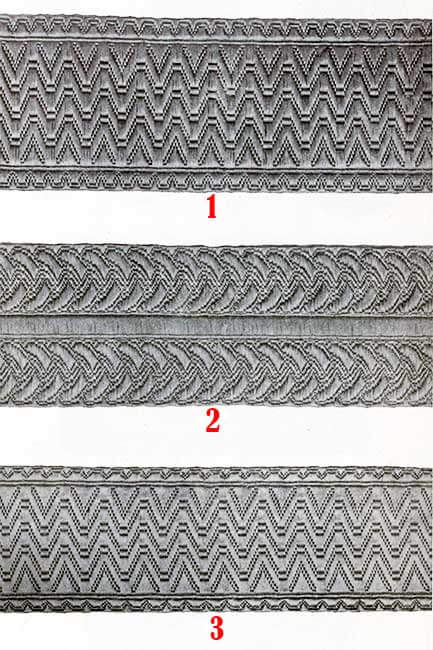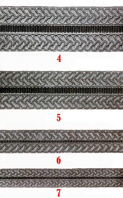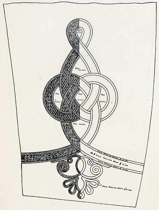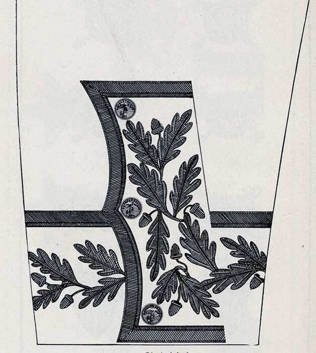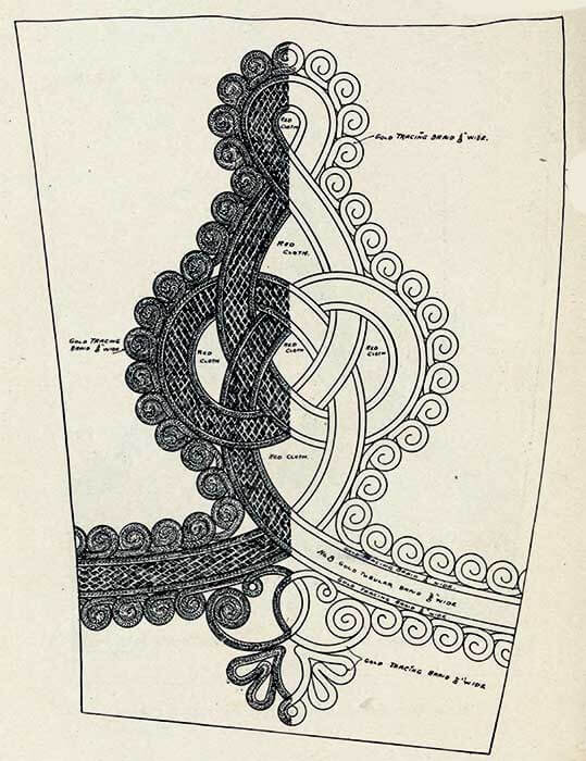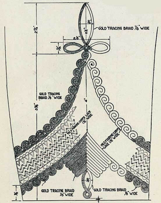 Корешок и часть подушечки внутри полумесяца обтянуты блестящей золотой кружевной тканью, а корешок окантован по бокам и на внутреннем конце витым шнуром диаметром 3/16 дюйма из золота, с каждой стороны которых позолоченная проволока диаметром 1/32 дюйма.