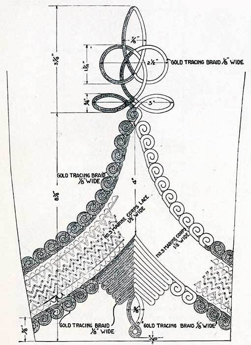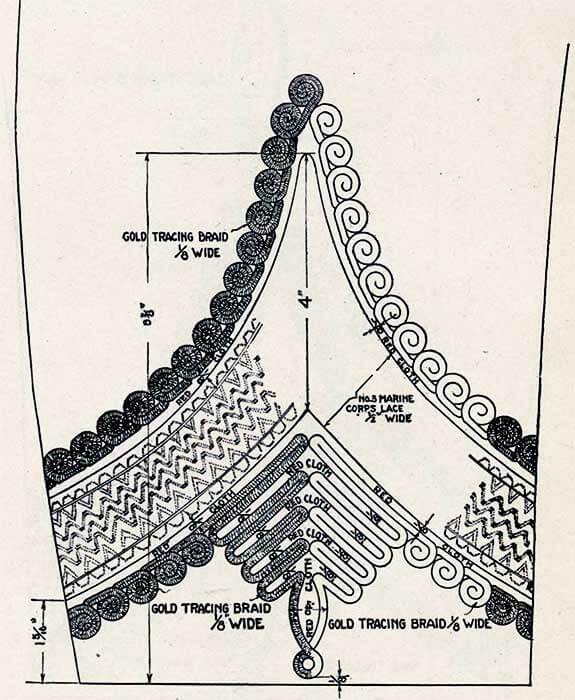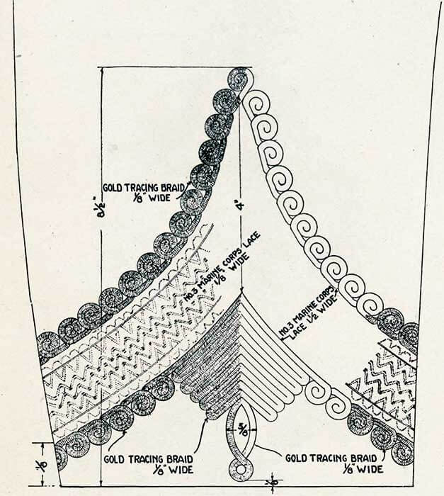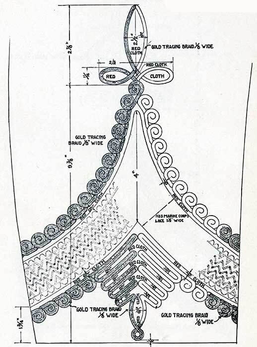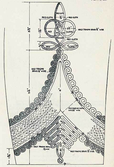 Парадный фрак представляет собой двубортный сюртук со стоячим воротником из темно-синего сукна на подкладке из черного шелка, с юбкой, спускающейся на 1 дюйм ниже промежности, с двумя рядами пуговиц морской пехоты, по девять пуговиц в каждом ряду, расстояние между рядами от 7 до 9 дюймов вверху и от 3 до 5 дюймов у талии, расстояния измеряются от центров пуговиц и пуговиц в каждом ряду.