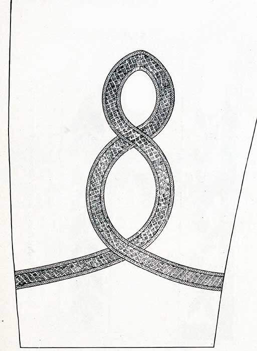 Вокруг полумесяца два смежных ряда скрученной позолоченной проволоки диаметром 3/32 дюйма. Снаружи металлического полумесяца полумесяц из золота диаметром 3/8 дюйма, из-под которого подвешена бахрома из 24 блестящих золотых нитей диаметром в ½ дюйма и 3 1/2 дюйма длиной.