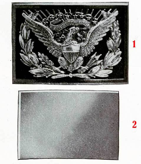Генерал-майор комендант и линейные бригадные генералы: корешок эполета шириной 2 3/4 дюйма и длиной 4 дюйма заканчиваться полем, который окружен ярким позолоченным металлическим полумесяцем размером 4 3/4 дюйма поперек и 3 дюйма вдоль поля.
