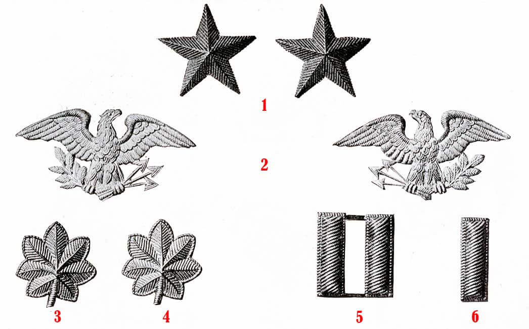Офицеры прикалывали свои знаки различия у внешнего конца погон; иногда их снимали в бою, чтобы не выделяться в поле зрения снайпера. Металлические стержни, которые носили лейтенанты и капитаны, обычно были отштампованы так, как если бы они были вышиты слитками.