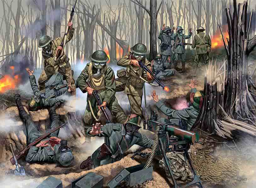 Пехота обеих сторон очень ненавидела пулеметчиков и, по словам одного морского пехотинца, «никогда не бралась в плен ни одной из сторон». На заднем плане другие морские пехотинцы взяли в плен поддерживающую немецкую пехоту.