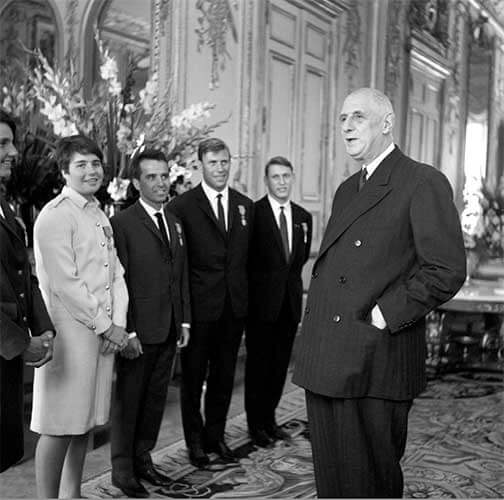Генерал де Голль вручает знаки отличия Национального ордена «За заслуги» олимпийским медалистам Инсбрукских игр в Елисейском дворце 25 июня 1964 года.