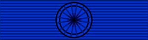 Звезда подвешена к лавровому венку, который через кольцо крепится к муаровой ленте синего цвета.