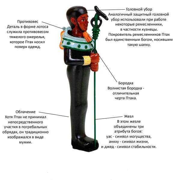 Он — один из немногих богов, не носящих короны. Её заменяет головной убор, который напоминает шлем и придаёт силуэту Птаха странные очертания.