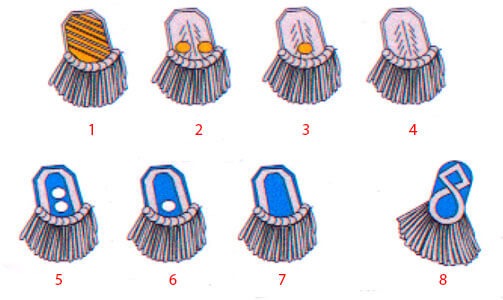 Знаками звания служили погоны и золотой кушак с красными прожилками.