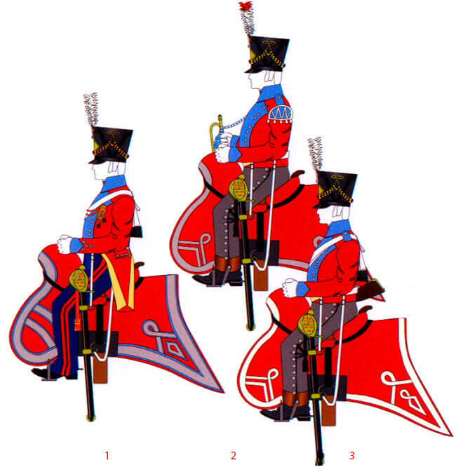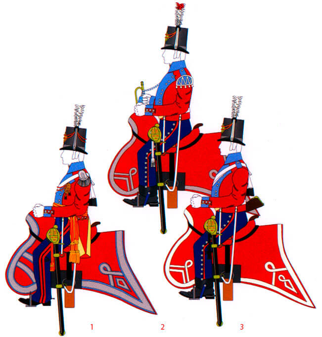 Трубачи носили голубые ласточкины гнезда с белыми косами и белый султан с красным кончиком.
