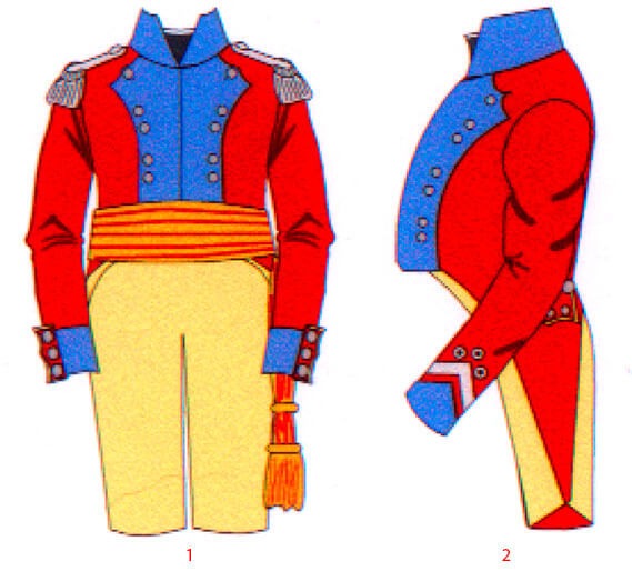 Офицеры носили малиновые длиннополые мундиры и темно-синие галифе с двумя красными кантами по бокам.