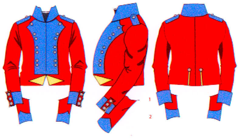 Воротник, пластрон, кайма и манжеты были светло-голубого цвета. Манжеты имели красные клапаны с соломенно-желтой окантовкой и три пуговицы.