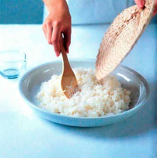 обмахивая его веером. Рис должен остыть до температуры тела, после этого из него можно готовить суши.