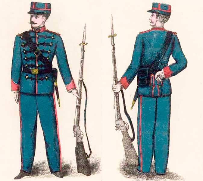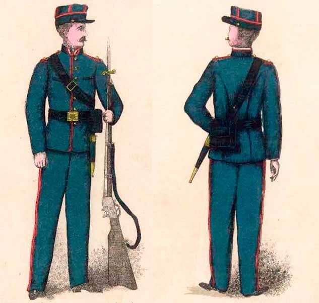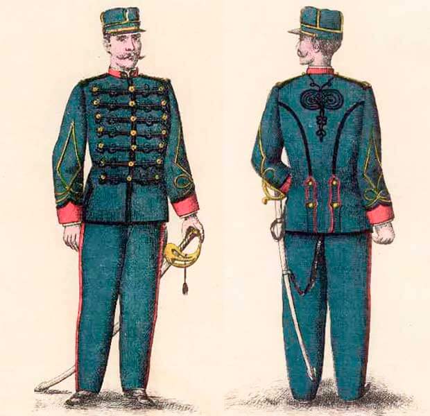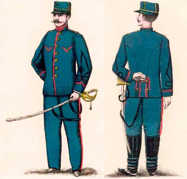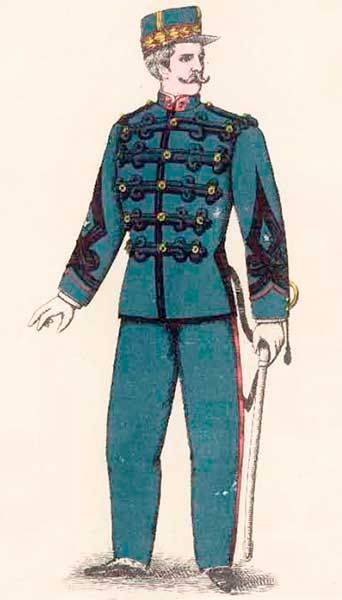 Повседневная форма офицеров артиллерии Коста-Рики состояла из кепи, мундира и темно-синих суконных или фланелевых штанов, черных кожаных ботильонов, сабли и лакированного ремня.