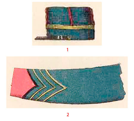 Кроме того, начиная с сержанта, на груди мундира были расположены два кармана, прикрытые треугольными клапанами с красным кантом, которые застегиваются на пуговицу.