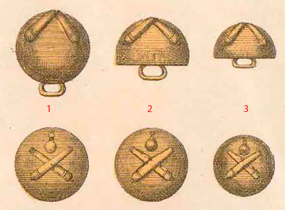 Мундир спереди застегивался на семь сферических пуговиц диаметром 18 миллиметров из бронзовой меди, на которых выбиты граната и две скрещенные пушки.