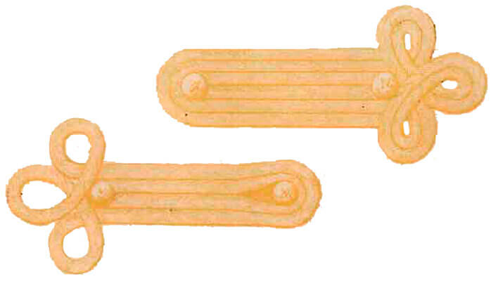 На рукавах — четыре, пять или шесть шнуровых тесьм шириной три миллиметра из золотой или позолоченной нити.