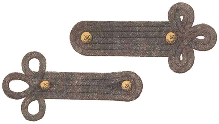 Спереди на груди мундира располагалось 7 рядов шнуров (бранденбургов) и по три полусферические пуговицы на ряд.