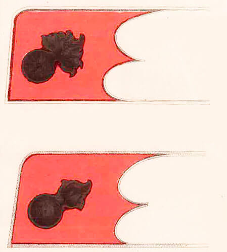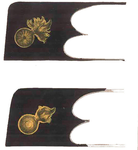 Воротник мундира прямой, высотой три сантиметра, с двумя углами (петлицами) алого цвета с наложенной гранатой.