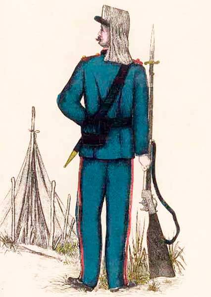 Униформа унтер-офицеров — второго капрала, первого капрала и второго сержанта — идентична описанной выше форме солдата, но они имеют, соответственно, одну, две и три косы из желтой шерсти, шириной 3 миллиметра, располагаемые горизонтально, начиная от верхней части кольца кепи и в виде острого угла на внешней стороне рукавов мундира. Вершина угла, образованного первой косой, находится на двенадцать сантиметров выше манжеты рукава.