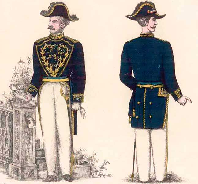 Повседневная форма шилась из темно-синего сукна и состояла из мундира и прямых брюк.